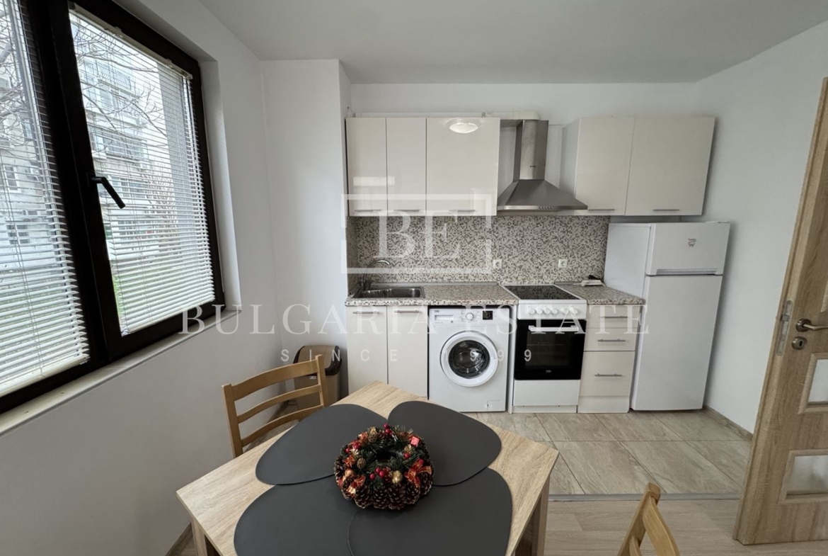 Апартаментът впечатлява със своя модерен интериор и отлично поддържано състояние. Състои се от просторен хол с кухненски бокс, който разполага с всички необходими електроуреди – пералня, печка, котлони, хладилник и фризер. От дневната има излаз към уютна тераса, идеална за сутрешно кафе или релакс в края на деня. Спалнята е светла и комфортна, а банята с тоалетна е оборудвана и поддържана в отлично състояние. Жилището има широк коридор, който допълва усещането за пространство и удобство.